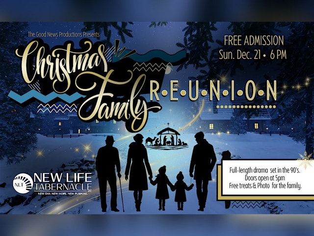 A Christmas Family Reunion A full length play presented by Good News Productions The Holidays have hit Waysbury and the Jones family are doing what they do best – cooking too much food, talking way too loudly, singing every Christmas carol known to man, and dragging every relative into one house whether they like it or not. Reimagined in the nineties, this unique twist on the classic story A Christmas Carol, will follow the lives of two estranged sisters Noelle and Grace. Noelle, hardened by ambition and worldly success, returns to the gathering more out of obligation than warmth. She dreads having to spend another year with her needy and boisterous family, not to mention her “Holier than thou” sister Grace. Grace, a faithful woman with a tender heart, hopes the season might bring reconciliation and healing. Exploring themes of memory, redemption, and the battle between worldly desire and eternal truth, a heartfelt Christmas story that is guaranteed to resonate deeply with audiences and invites you to reflect on where your path is leading you. Doors open at 5pm with free photo backdrops, hot cocoa and treats. All ages are welcome.