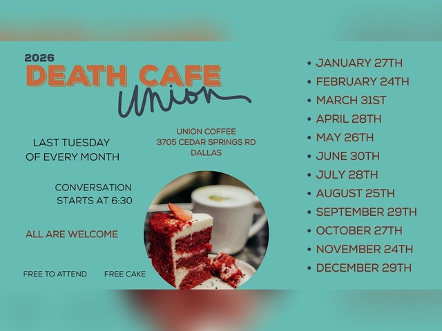 At Death Cafe Union, we invite individuals of all backgrounds to engage in open conversations about death and dying. We foster a supportive environment where diverse perspectives are respected, and participants can freely express their thoughts, fears, and experiences. This is a free event, open to anyone who wishes to share or simply listen. What to Expect * Casual Conversations: Engage in meaningful discussions about a topic that is often considered taboo. Feel free to share your unique perspective or simply listen to others. * Supportive Environment: We prioritize creating a safe and respectful space for all attendees, where every voice is valued. * Cake: Enjoy complimentary cake from our sponsor Snap Bakeshop [https://www.snapbakeshop.com/] ***Please note: this event is held upstairs in a historic building with no elevator. For an accessible event, please visit Death Cafe Dallas [https://www.eventbrite.com/e/death-cafe-dallas-tickets-1983978618455?aff=ebdsshcopyurl&utm-campaign=social&utm-content=attendeeshare&utm-medium=discovery&utm-term=]