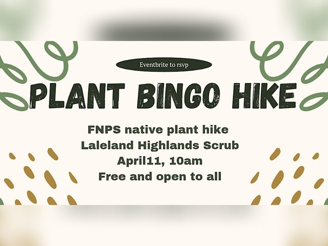An easy hike while playing bingo with native plants in a family-friendly environment Come prepared for Florida weather and outdoors. This trail is mostly flat and stroller/kid and beginner friendly. All welcome.