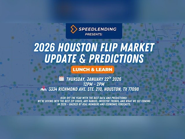 📍 What actually happened in Houston’s flip market last year? And where’s it going now? Join us for the first Flip Talks of the year — 2026 Houston Flip Market Update & Predictions — where we’ll break down everything you need to know to get ahead of the game. We’re bringing data, experience, and insights straight from our lending desk so you can invest with confidence in Q1 and beyond. Here's what we'll cover: 📊 Houston Flip Market 2025 in Review * Hottest zip codes for flips last year * Where ARVs held strong — and where they didn’t * Average deal sizes, exit prices, and margins * How long flips sat on the market (and why) 🔮 2026 Predictions * Where the market is heading (and what to watch for) * Best-performing price ranges * Zip codes heating up (and those cooling off) * What we’re funding — and what we’re passing on You’ll walk away with a clear, local playbook for where to focus your efforts this year. 🍽️ What’s Included: * Free lunch * Printed ZIP code and ARV heat maps * Investor worksheet: “Where to Focus in 2026” * Networking with investors, agents, wholesalers & lenders * A Q&A round with the SpeedLending team 🎯 Bonus: Attendees get early access to our "Top Deals of the Quarter" investor sheet. 🗓️ Date: Thursday, January 15th 🕛 Time: 12:00 PM – 2:00PM📍 Location: 3334 Richmond Ave. Ste. 210, Houston, TX 77098 🚀 Start your year with data, not guesses. Seats are limited — RSVP now!