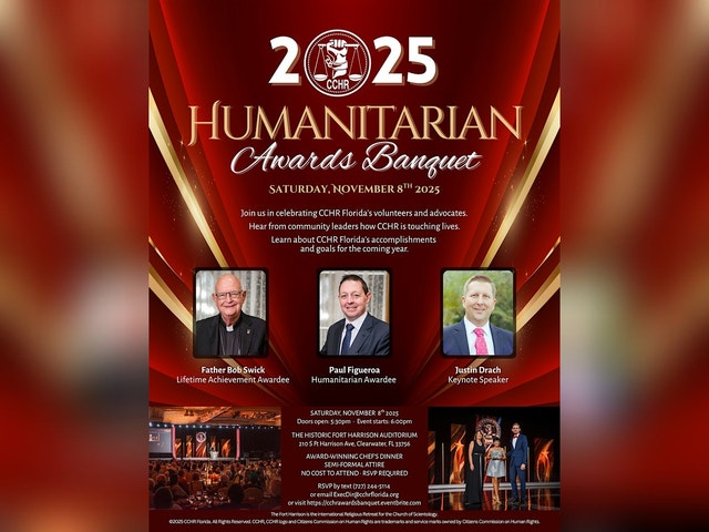 Join us to acknowledge the 2025 CCHR Florida Humanitarian Award Winner, Attorney Paul Figueroa. Celebrate the 2025 CCHR Florida Lifetime Achievement Awardee, Father Bob Swick. Hear from community leaders how CCHR is touching lives across our state. Learn about CCHR Florida’s accomplishments and goals for the coming year. THE HISTORIC FORT HARRISON AUDITORIUM Doors open: 5:30pm Event starts: 6:00pm AWARD-WINNING CHEF’S DINNER . PROFESSIONAL PHOTOS . DANCING . FORMAL ATTIRE No Cost to Attend RSVP required Text (727) 244-5114 or email ExecDir@cchrflorida.org