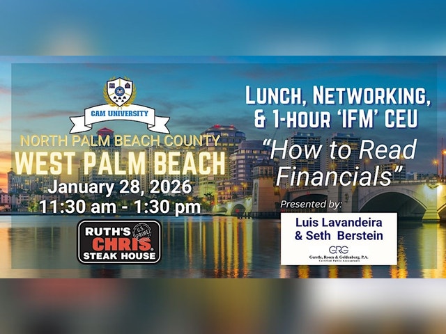 Join us for a fabulous lunch at Ruth's Chris and hear from Luis Lavandeira & Seth Berstein of Gerstle, Rosen & Goldenberg as they present a 1-hour 'IFM' CEU called "How to Read Financials". Network with great business partners, have an amazing lunch, and get a CEU credit! 11:30 am - 1:30 pm