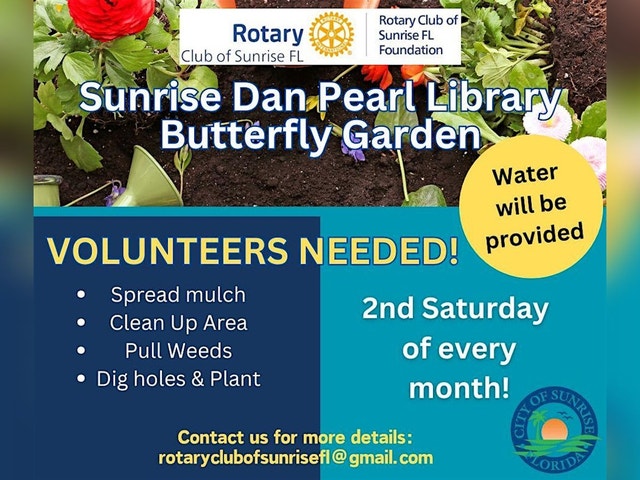 Join us for a beautiful service project! πΏπ¦ Where: Sunrise Dan Pearl Library Butterfly Garden We'll be working together to maintain this stunning garden, and we need your help! πΈπ¦ Important Details: - Wear comfortable clothing and sneakers/closed-toe shoes (we'll be getting dirty!) - Hats and sunscreen recommended - Bring your own gloves if you have them - Children under 16 must be accompanied by an adult - Court-ordered volunteers not permitted Let's come together to make a difference in our community! π Join us for a fun and rewarding morning of service. Visitors are welcome! Rotary is a community service organization. We often invite nonprofit organizations to speak at our meetings. Our Rotary YouTube Channel: https://www.youtube.com/@rotaryclubofsunrisefl [https://www.youtube.com/@rotaryclubofsunrisefl] Sunrise Rotary YouTube Channel: https://www.youtube.com/@rotaryclubofsunrisefl [https://www.youtube.com/@rotaryclubofsunrisefl] To subscribe: https://www.youtube.com/@rotaryclubofsunrisefl/?sub_confirmation=1 [https://www.youtube.com/@rotaryclubofsunrisefl/?sub_confirmation=1] View Rotary International videos at: https://www.youtube.com/@RotaryInternational [https://www.youtube.com/@RotaryInternational]