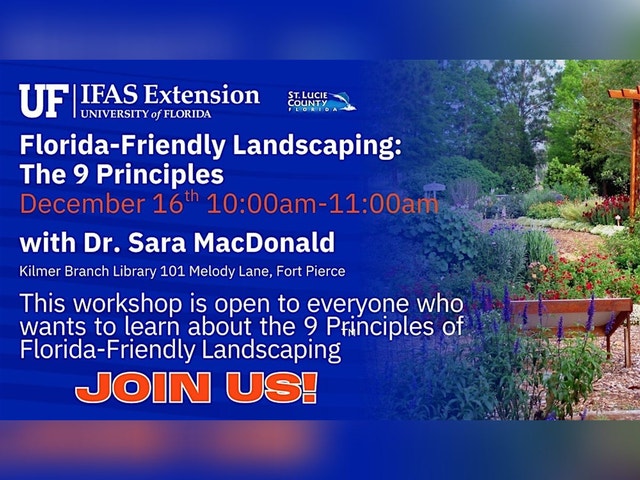 Join Dr. Sara MacDonald, UF/IFAS Extension Urban Horticulture Agent, to learn the nine principles of FFL and how to become a certified Florida-Friendly Landscape Professional. All resources are based on UF/IFAS research. Space is limited, and registration is required. If you have any questions, please feel free to contact Dr. MacDonald at 772-462-1135 or via email at Sara.Macdonald@ufl.edu. Cancellation Policy: Programs, workshops, and events are subject to cancellation if a minimum number of attendees are not registered. Cancellations will be posted on Eventbrite, and an email will be sent to registrants.