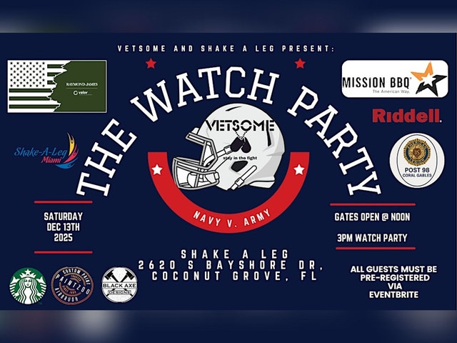 Join the party with your Veterans, active military, first responder communities and multiple VSOs from South FL for a day of camaraderie & trash-talk as we watch one of the greatest rivalries in sports. On the gorgeous waterfront, the indoor-outdoor venue at the 93-year old Coast Guard hangar in Coconut Grove is the perfect setting for fans of America's Finest... Gates open @ noon, The Watch Party starts @ 3 p.m. Admission is FREE and open to the public. ALL GUESTS must register via Eventbrite. ...and VETSOME Giveaways is back, so a few lucky winners will be drawn from our Veteran and active-duty attendees to receive some great gifts from our Dolphins, Marlins, Panthers and HEAT!.