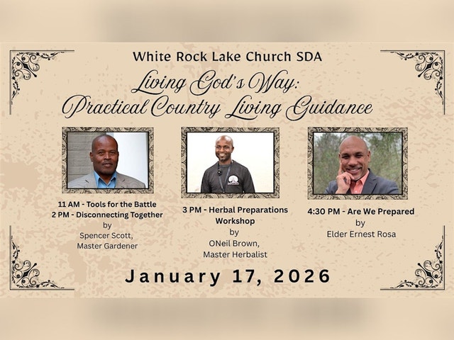 LIVING GOD’S WAY: A PRACTICAL COUNTRY LIVING EXPERIENCE Ready to take real steps toward a simpler, healthier, more grounded lifestyle? Join us for a special presentations by Country Living experts focused on practical skills, hands-on learning, and spiritual encouragement. Speakers: * Spencer Scott, Master Gardener * ONeil Brown, Master Herbalist * Elder Rosa We will have a workshop in the afternoon as well! From gardening and herbal wisdom to faith-filled guidance, this day is designed to help you see how and when to move toward country living. Come learn, grow, and be inspired to follow God’s leading into a lifestyle of peace and purpose. All are welcome! RSVP for a lunch ticket.