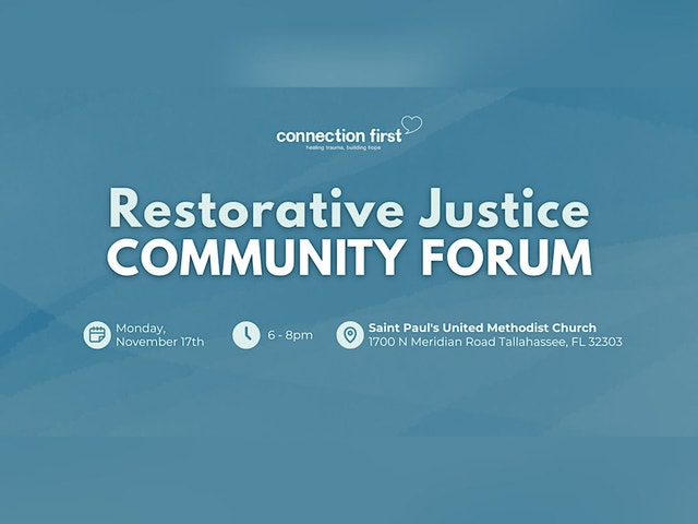Restorative Justice Community Forum Join us on Monday, November 17th from 6:00–8:00 p.m. at St. Paul’s United Methodist Church – Sanders Hall for an inspiring evening of dialogue and connection. This year’s Forum features a panel of participants who have experienced our RJ Program firsthand. Their stories of accountability, healing, and transformation highlight the real impact restorative justice has in our community. We’re inviting community members, elected officials, law enforcement, attorneys, and school-based and faith leaders—key voices in building a more restorative, connected community. We hope you’ll join us for this free evening of connection, learning, and dialogue about creating safer, more supportive communities through restorative justice practices. Please feel free to pass this along to anyone who might be interested in attending. This event is taking place during International Restorative Justice Week (Sun. Nov. 16-Sat., Nov 22). Connection First will be hosting several different events throughout that week! Stay tuned on our website for more information: www.connectionfirst.org Here's the link [https://www.facebook.com/share/17PVpyGChz/] to the Facebook event page as well!