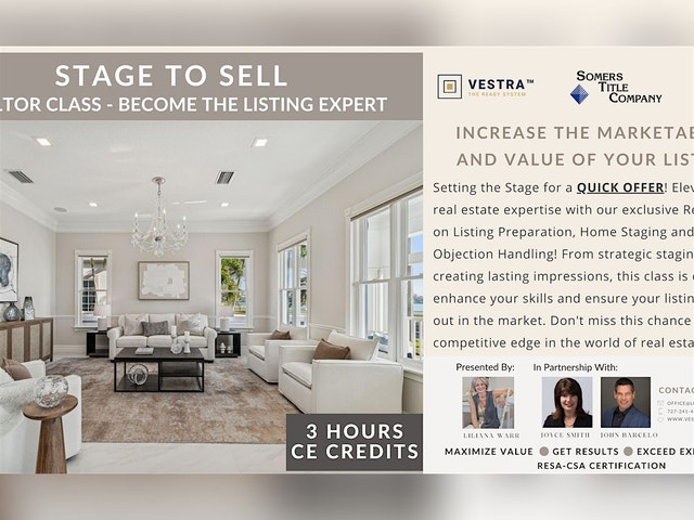 Elevate Your Selling Strategies: Join Our Exclusive Class! We are excited to introduce a transformative class designed to empower you with cutting-edge strategies that will elevate your selling game to new heights! Our goal is simple yet profound: to make you not just good, but exceptional at what you do. Enroll in our dynamic class to acquire the skills that will give you unparalleled control over listing appointments, enable you to secure more listings, and sell them faster than ever before! In this class, we'll break free from convention and explore innovative approaches to listings. You'll discover strategies that empower you to: 🔑 Persuade sellers to embrace staging with confidence and enthusiasm. 🌟 Elevate your personal brand and reputation as a top-tier agent. 💨 Propel even "as-is" listings to swift sales. 🏠 Tackle those tricky, unconventional spaces with ease. 🎭 Use home staging to deftly address disclosure concerns. 💰 Demonstrate the tangible value and ROI of staging. But that's just the tip of the iceberg! Our class is packed with insights, techniques, and practical advice to give you an edge in a competitive market. By completing this program, you'll be equipped to reshape the course of your real estate career and achieve results that speak for themselves. Secure your spot now and share this invitation with fellow agents ready to supercharge their journey in real estate. Provider #6845 Course #17744