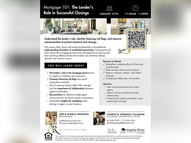 This course provides Texas real estate professionals with a foundational understanding of the lender’s role in residential real estate transactions. Participants will gain insight into the mortgage process from pre-approval through closing, common financing red flags that can jeopardize contracts, and how lender communication impacts transaction outcomes. The course is designed to help agents collaborate more effectively with lenders and reduce delays, denials, and contract fallout.