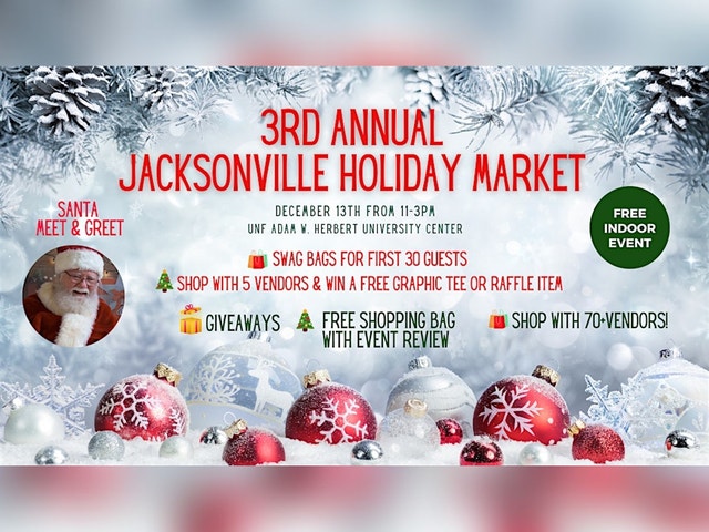 Bringing together local artisans, crafters, and creators to showcase their unique talents. Discover a wide variety of handmade goods, including jewelry, artwork, home, clothing, and much more. š¢ Reserve your Free Reminder Ticket for the chance to win $25 market bucks! š¢ Free Indoor event š¤ Support & Shop Local; 70+ Creatives & Retailers šļø Swag bags for first 30 guest š° $25 market bucks given away every hour š Raffles š Shop 5 Vendors & Choose a graphic Tee or raffle item šļø Free Item with Facebook Event Review ā Nonprofit Spotlight: All nonprofits at the event š¢ Become a sponsor or vendor [https://www.jacksonvillebusinessconnections.com/jax-holiday1-application] š¢ Follow the Facebook Event for Updates [https://www.facebook.com/events/1291629575322625]