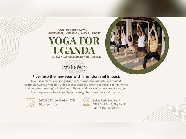 MOVE WITH INTENTION. GIVE WITH PURPOSE. Start the new year grounded in movement, community, and compassion. This special yoga fundraiser invites you to come together in support of meaningful work in Uganda, using mindful movement as a way to send positive energy far beyond the mat. This all-levels yoga class is designed to help you reset, reconnect, and set intentions for the year ahead — while directly contributing to initiatives that create real impact and opportunity abroad. Whether you are a seasoned yogi or brand new to the practice, this experience is welcoming, inclusive, and rooted in purpose. All proceeds from the event will benefit charitable efforts supporting communities in Uganda. Come move your body, open your heart, and help send good vibes around the world as we step into the new year together.