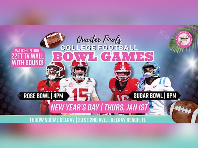 Join us New Year's Day for the College Football Playoff Quarterfinals streaming LIVE with SOUND on our massive 22-foot TV wall. * Thursday, Jan 1st | OPEN from 1pm-12am * Free Entry | no reservations are required 🏈 22-FT JUMBOTRON with SOUND!! * 4pm: #1 Indiana vs. #9 Alabama (Rose Bowl) * 8pm: #3 Georgia vs. #6 Ole Miss (Sugar Bowl) 🍻Beer Specials: $20 Domestic Beer Buckets & $25 Import Beer Bucket Specials 🏈 Cocktails, Seasonal Sips, Tasty Food & more! *full menus available [https://www.throwsocial.com/db-menus] 🏈 Jumbo Backyard Games: Corn Hole, Beer Pong, Basketball Toss, Ping-Pong & more! 🏈 Outdoor Patio with retractable roof, plenty of seating & room to flamingle. 🏈 VIP Cabanas: [https://www.throwsocial.com/book-delray] Reserve a designated spot for up to 10 guests with comfy, plush seating. THRōW Social Delray Beach [https://www.throwsocial.com/delray] 📍 29 SE 2nd Ave, Delray Beach, FL 33444