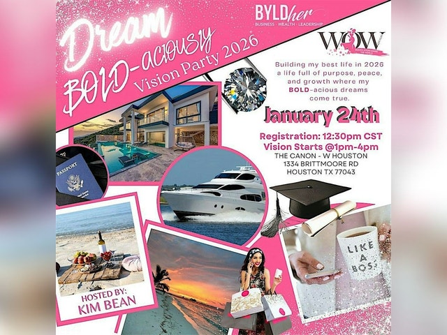 JOIN THE DREAM BOLD-ACIOUSLY VISION BOARD PARTY 2026! Get ready to ignite your creativity and set your goals for the new year in a fun, upbeat atmosphere. This in-person gathering is all about being on purpose, dreaming big and crafting a vision board that'll keep you inspired all year long. Bring your friends, your favorite magazines, and your boldest dreams – and join a community of like minded ladies to make 2026 the year you dream boldly and live even bolder! DUE TO LIMITED SEATINGS, ATTENDANCE IS RESTRICTED TO REGISTERED GUESTS ONLY.