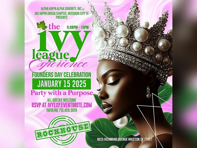 ALPHA KAPPA ALPHA SORORITY INC. ΜΚΩ Pretty Girl Productions presents presents THE IVY LEAGUE EXPERIENCE Lights, Camera, Legacy:The Ivy League Experience 2.0 PARTY WITH A PURPOSE Please mark your calendars as we gather to celebrate 118 years of sisterhood, service, and excellence. Thursday January 15th 2026 at PROSPECT PARK 3100 Fountain View Houston TX 77057 5:08pm Until DJs Youngstreez & Q Holic inDmix All Greeks Welcome RSVP at http://ivyexp.eventbrite.com [https://ivyexp.eventbrite.com] Infoline 713.459.9019