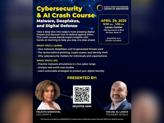 Join us for an interactive cybersecurity workshop with Felicita Sandoval, CEO of Sentient Perspectives, and expert Miguel El Lakkis! Take a deep dive into today’s most pressing digital threats and discover how to defend against them. This crash course blends expert insights with hands-on learning to help you stay one step ahead. What You’ll Learn: • How malware, deepfakes, and AI-generated threats work • The tactics behind phishing, crypto scams, and identity theft • Why cybersecurity matters for individuals and organizations What You’ll Do: • Practice malware simulations in a live cyber range • Analyze real-world case studies • Learn actionable strategies to protect your digital identity Bonus: Explore cybersecurity career paths with a free roadmap packet.