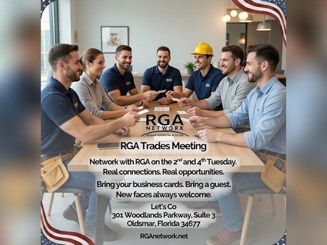 Build Stronger Connections at the RGANetwork.net [https://l.facebook.com/l.php?u=http%3A%2F%2FRGANetwork.net%2F%3Ffbclid%3DIwZXh0bgNhZW0CMTAAYnJpZBEyaEpSekZCUkZNa2lWcklXd3NydGMGYXBwX2lkEDIyMjAzOTE3ODgyMDA4OTIAAR7K48xLukM56CDu2MS4ugo8cW_zPfLvgwsD3x9Yxc7m_jRzrGzRTzPS8c7hPw_aem_WzDOi1J-IepYAWO5uDLDkA&h=ASWUZZPabXaGYaEXpF_LUj_bOn3f66UnIbLtEAtUju_whvZflXgGeuHDdkrXbIRoJnlIUcAyg-Vo-aRr7_ETukxgSgEgCyxAsxZGzOBmdLTJTkbe2y5z230UJ0dk8u4ff_lco405cP-SXAHO&__tn__=q&c[0]=ASVsVQG-FUEhtavN3yPcEF7sTDhCqBSQ2yTnG5zj9zh_xtZCiyww9IhmcOHgftz-S2Za3DwlbGL-8ZSk6iLnXEhIU-5kF8JLNGxwYkgIokI-_4brBwaGdYGvR_r-mQLk6s1tQDfDh16mH9mbATdpdQmtkWg_r3fQJxY] Trades & Construction Breakfast Meeting! When: 2nd and 4th Tuesday of every month Time: 7:30 AM – 8:30 AM Where: Lets Co Oldsmar 301 Woodlands Parkway, Suite 3 Oldsmar, Florida 34677 Attention Trade & Construction Professionals: Start your morning with a dynamic group of industry leaders and marketing representatives who are ready to connect, collaborate, and grow their businesses. Who Should Attend? This event is tailored for: General Contractors Electricians Plumbers HVAC Specialists Roofers Flooring Experts Painters Remodelers Landscapers Pool Builders Window & Door Installers Cabinet Makers Handymen Pest Control Specialists Solar Installation Experts Sign and Awning Companies AND MORE! Why Attend? Referrals: Meet professionals who can help you land your next big project. Collaboration: Partner with complementary trades to tackle larger jobs and grow your business. Education: Share industry insights and learn from other professionals. Community: Build relationships with people who truly understand the trades and construction world. Visibility: Promote your business to others who are actively seeking your services. Whether you’re the owner of a construction company, a trades professional, or a marketing representative in the industry, this is YOUR opportunity to expand your network in a way that matters. Bring your business cards, your pitch, and your drive to succeed! Let’s make connections that build more than structures—let’s build success. RGA: Where Trades Meet Trust #NetworkingForTrades #ConstructionNetworking #RGANetwork #BuildYourBusiness #TradesProfessionals #ClearwaterNetworking #GrowYourConnections #CollaborateAndBuild #TradesCommunity