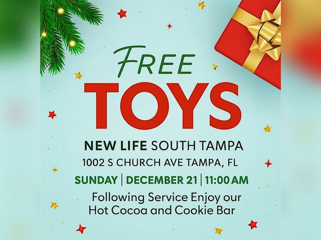 Celebrate the season with us at New Life South Tampa! We’re gathering for our 11:00 AM Sunday service, and immediately following service we’ll be blessing families with a FREE Toy Giveaway. After the giveaway, stick around and enjoy our Hot Cocoa & Cookie Bar—a fun, warm way to connect and make memories. What to expect: * Sunday Service at 11:00 AM * Free Toys giveaway right after service * Hot Cocoa & Cookie Bar right after Everyone is welcome — come as you are and bring a friend!