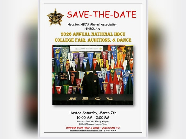 FREE College Fair, Auditions, Theater & Dance information sharing sessions along with workshops, giveaways, Free Shots, Mental Health, HIV Health information. AVAILABLE NOW: 1. SPONSORSHIP, PARTNERSHIP, VOLUNTEER, & SCHOLARSHIP OPPORTUNITES. 2. HBCU SCHOOL CONFIRMATIONS ACCEPTED EMAIL: hhbcuaaexecutivedirector@yahoo.com HHBCUAA SCHOLARSHIP One of our HHBCUAA Scholarship Applications is only available by attending our Annual HBCU College Fair. Application pick-up is during our college fair hours (10AM - 2PM). Visit our Scholarship Program: https://www.hhbcuaa.org/scholarships/ GRADUATING SENIORS PLEASE BRING THE FOLLOWING WITH YOU: I. TRANSCRIPT. II. TEST SCORES. III. IF RECEIVING VACCINATIONS: A. Insurance Card if insured. You can still receive shots if uninsured. B. Your Shot Records. (Ask your school for a copy if you do not have a copy.) 1. Good idea to bring and allow Health Staff to verify you have all required shots to enter college. IV. Please complete Admissions & Academic Scholarship Applications in advance and proceed to Recruiter Table with your questions. HEALTH DEPARTMENTS FREE ONSITE AVAILABLE TO ALL: (1) Meningitis Vaccine. (2) COVID. (3) Other Senior Citizen Free Shots. You can still have the vaccinations if you are uninsured. If you are insured, please BRING A COPY OF YOUR INSURANCE CARD. BRING A COPY OF YOUR SHOT RECORDS with you. WORKSHOP SPONSORSHIPS AVAILABLE Financial Aid/Admissions - A Conversation with Students - Industry/Workforce Outlook - Athletics - NETWORKING MIXER & RECEPTION SPONSOR Sponsorship Opportunity Available Now! Call: 832-819-9426 CONFIRMED COMMUNITY PARTNERS Business Associates LLC City of Houston Health Department Harris County Public Health - HIV/STI Prevention Program Buffalo Soldiers National Museum Harris County Constable Precinct 6 - Assistant Chief Tony Bryant Huston-Tillotson Houston Alumni Chapter Paper Pencil Pen National Coalition of Black Women - Houston Academia in Motion (AIM) CONFIRMED BANDS TO-DATE Morehouse College Marching Band Prairie View A&M Univerity Marching Band Grambling State University Marching Band Texas Southern University Marching Band Wilberforce Uniiversity Marching Band Kentucky State University Marching Band Xavier University of Louisiana Marching Band Southern University and A&M College Marching Band CONFIRMED CHOIRS TO-DATE Kentucky State University Marching Band CONFIRMED THEATER REPS TO DATE: MOCK DANCE AUDITIONS will take place. CONFIRMED HBCUs TO-DATE Grambling State University - Accepting Students Onsite, Out-of-State Tuition Waived if requirements met. American Baptist College Huston Tillotson University St. Philip's College Miles College Howard University Wilberforce University Paul Quinn College Lincoln University (Missouri) Prairie View A&M University Benedict College Jarvis Christian University Southern University and A&M College - Baton Rouge - Out-of-State Tuition Waived if requirements met. Southern University in Shreveport Louisiana - Southern University and A&M College - Baton Rouge - Out-of-State Tuition Waived if requirements met. Southern University Law School Southern University - New Orleans Texas College Norfolk State University Jackson State University Tougaloo College Texas Southern University Tennesee State University Tuskegee University Alabama A&M University Alabama State University Clark Atlanta University Dillard University - Out-of-State Tuition Waived if requirements met. Xavier University - Out-of-State Tuition Waived if requirements met. University of Arkansas at Pine Bluff Florida A&M University West Virginia State University Wiley University American Baptist College Morgan State University Virginia State University Alcorn State University - SENIORS: Deadline for Academic Scholarship is March 15th. Complete both Admissions & Academic Scholarship Applications before arriving. Bowie State University Meharry Medical College Allen University Stillman College Morehouse College