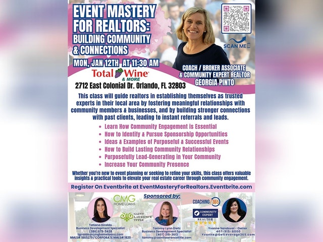 Event Mastery for Realtors: Building Community & Connections This class will guide realtors in establishing themselves as trusted experts in their local area by fostering meaningful relationships with community members & businesses, and by building stronger connections with past clients, leading to instant referrals and leads In this class, you will learn how to: Understand the Importance of Community Engagement: Learn why hosting community events is crucial for building your brand and becoming a local expert. Design Purposeful Events: Acquire the skills to plan and execute events that align with your community’s needs and your professional goals. Identify and Pursue Sponsorship Opportunities: Master the art of finding and securing sponsors to pay, support, and advertise your event to their database of clients, which grows your reach and builds relationships with local business owners. Build Lasting Community Relationships: Develop strategies for nurturing long-term relationships with attendees and local businesses. Customer Appreciation Techniques: Learn how to host memorable customer appreciation parties that reinforce client loyalty and generate referrals. DATE: Monday Jan 12th, 2026 TIME: 11:30 AM - 2:00 PM LOCATION: Total Wine & More Classroom, Colonial Plaza , 2712 East Colonial Drive, Orlando, FL, 32803 REFRESHMENTS: Courtesy of our Sponsor, CMG Home Loans, Up & Down Electrical Services & Saint Lawrence Title Whether you're new to event planning or seeking to refine your skills, this class offers valuable insights & practical tools to elevate your real estate career through community engagement.