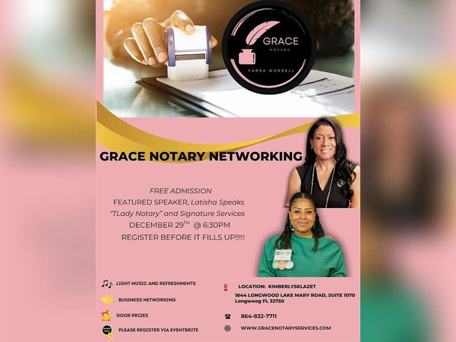 JOIN US FOR GRACE NOTARY MONTHLY NETWORKING! Get ready to connect, chat, and grow your notary network in person! GRACE NOTARY MONTHLY NETWORKING is the perfect spot to meet fellow notaries, share tips, and build lasting relationships. Join us at th4e beautiful "KimberlysKlazet" located in Longwood Florida. Whether you're new or a pro, come hang out and boost your skills in a friendly vibe. Don’t miss out on this awesome chance to mingle and learn face-to-face! Our keynote speaker will be Latisha Speaks "Tlady Notary and Signature Services" Latisha is a highly experienced Notary who has been comissioned in 3 states! Come out and glean from a true expert. We will have light bites and door prizes. FCFS. REGISTER TODAY!