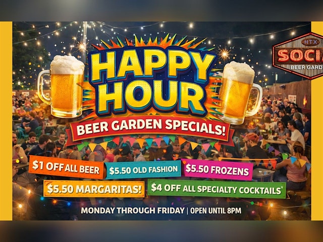 Join us for Happy Hour at Social Beer Garden HTX — where great drinks, good vibes, and an unbeatable patio atmosphere come together. Enjoy: • $1 Off All Beer • $5.50 Old Fashioneds • $5.50 Frozens • $5.50 Margaritas • $4 Off All Specialty Cocktails We’re serving up specials Monday through Friday and keeping the good times rolling until 8PM. Whether you're winding down after work, meeting friends, or starting your night early, our indoor bar and spacious outdoor beer garden set the perfect scene. Grab a table, catch the game on our big screens, and make Happy Hour your favorite hour.