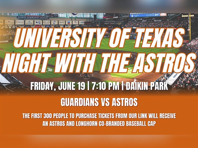 Join the Houston Astros and the University of Texas community for an exclusive Longhorn Night at Daikin Park as the Astros take on the Cleveland Guardians! Event Details: * Date: Friday, June 19, 2026 * Time: 7:10 PM first pitch * Location: Daikin Park, Houston, TX * Cost: Tickets start at $42 * BONUS: First 300 to purchase receive an exclusive co-branded Longhorn/Astros hat! Exclusive Swag Alert! š§¢ The first 300 Longhorns to purchase tickets through our group link [https://www.gofevo.com/event/Universitytexas43] will receive a LIMITED EDITION co-branded University of Texas and Houston Astros hat! These won't be available anywhere else, so don't wait! How to Get Your Tickets: * You MUST purchase through our exclusive Fevo link [https://www.gofevo.com/event/Universitytexas43] * Tickets purchased any other way will NOT include the hat or group seating * Sit with fellow Longhorns in our designated group section What to Expect: ā¾ Premium group seating at Daikin Park š§¢ Exclusive co-branded hat (first 300 only!) š¤ Cheer alongside fellow Longhornsāstudents, alumni, families, and fans šŗ Access to all Daikin Park concessions and amenities š§” Show your burnt orange pride at the ballpark! Who Should Attend? * UT students, alumni, and families * University of Texas fans and supporters * Houston Astros fans who bleed burnt orange * Anyone who wants exclusive UT x Astros gear! Important Information: * Purchase your tickets through the Fevo link [https://www.gofevo.com/event/Universitytexas43] * Hat availability is first-come, first-served (first 300 purchases only) * Tickets are non-refundable * Group seating section assigned based on purchase date * Parking: Multiple garages and lots available near Daikin Park REMINDER: You must purchase tickets through our Fevo link to receive the hat and group seating. Game tickets are NOT included in this Eventbrite registration. Questions? Contact spacecitycommittee@texasexes.com Don't miss this chance to get exclusive Longhorn x Astros gear! Purchase your tickets now [https://www.gofevo.com/event/Universitytexas43]!š¤ā¾