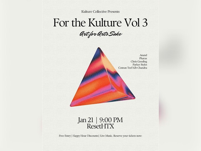 For the Kulture Vol. 3 For the Kulture returns January 21st for Volume 3 — marking the next evolution of the movement. What began as a community-first house night has grown into one of Houston’s most exciting emerging nightlife platforms. Vol. 3 represents a shift into bigger energy, elevated production, and more intentional programming, while staying true to what built this from the start: music, people, and connection. Expect a high-energy journey through house, tech house, UKG, bass, and groove-driven sounds, curated to keep the dance floor moving all night. This is a space for dancers, creatives, artists, and anyone who believes nightlife should feel inclusive, intentional, and alive. For the Kulture isn’t just an event, it’s a growing platform for Houston’s dance community. What to Expect: 🎧 Curated DJ performances all night ⚡ High-energy, dance-focused atmosphere 🍸 Full bar & drinks available 💃 A welcoming crowd and community-driven vibe 📸 Professional photo & video coverage Event Details: 📅 Date: January 21 🕘 Time: 9:00 PM – Late 📍 Location: Reset HTX 🎟️ Entry: RSVP Whether you’ve been with us since Volume 1 or this is your first time stepping into the Kulture, this night is for you. Come dance. Come connect. Come be part of what’s next.