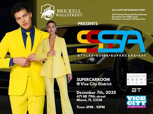 STYLES • SUITS • SUPERCARS • ART (SSA) Presented by Brickell WallStreet ART BASEL WEEK INVITE ONLY- RSVP MUST MEET REQUIREMENTS Join us for an unforgettable night of sophistication, networking, and luxury at Styles • Suits • Supercars • Art (SSA) — where high fashion meets high performance. Hosted by Brickell WallStreet, this exclusive networking event brings together elite founders, investors, visionaries, and professionals for a one-of-a-kind financial powerhouse experience in the heart of Miami. Surrounded by exotic supercars, stunning art, and the city’s most influential minds, this event is designed for those who live boldly, dress sharply, and think futuristically. WHAT TO EXPECT * A curated evening blending Style, Suits, Supercars, and Art * Exclusive networking with top-tier entrepreneurs and investors * A showcase of luxury vehicles and fine art installations * High-end ambiance designed for deal-making and inspiration * Premium cocktails, food, music, and luxury brand experiences DRESS CODE Dress to Impress – Match the elegance and performance of the supercars you’ll be surrounded by. Think bold, refined, and photo-ready. ABOUT BRICKELL WALLSTREET Brickell WallStreet is Miami’s premier ecosystem for entrepreneurs, investors, and professionals. Through exclusive events and community-driven initiatives, we connect innovators with opportunities — bridging the worlds of finance, culture, and technology. SPONSORSHIP OPPORTUNITIES We are currently accepting sponsorships for this event. Partner with Brickell WallStreet to position your brand among high-net-worth individuals, investors, and business leaders. Sponsors receive premium brand visibility, VIP access, and the opportunity to engage directly with influential guests in a luxury setting. 📩 For sponsorship inquiries, please contact: brickellwallstreet@gmail.com