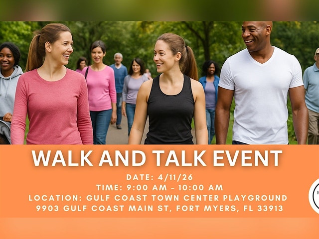 Event: Walk and Talk Event Date & Time: 4/11/2026 | 9:00 AM - 10:00 AM Location: Gulf Coast Town Center Playground 9903 Gulf Coast Main St., Fort Myers, FL 33913 🗓 What We’ll Do Start as a group at the playground * Stretch * Pair into buddy teams * Use light conversation prompts * Go on the walk * Meet back up at the meeting spot 💬 Why It Matters Walk & Talk events help people feel less isolated, connect with neighbors, and enjoy meaningful conversation while moving their bodies. 👟 What to Bring * Comfortable clothing * Walking shoes * Water *** Your input will help us refine the structure, pacing, and overall experience.