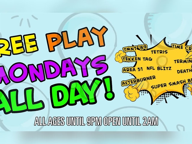 Join us every Monday for Free Play on several games! Open at Noon, All Ages until 9PM.