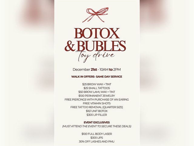 JOIN US FOR BOTOX & BUBBLES! Looking for a fun way to refresh your look and sip on some bubbly? Botox & Bubbles is the perfect in-person event for you! Bring a toy, or donate for to a good cause & enjoy a little self-care with friends. It’s all about good vibes, great company, and feeling fabulous. Don’t miss out on this chill, stylish gathering—come for the botox, stay for the bubbles!