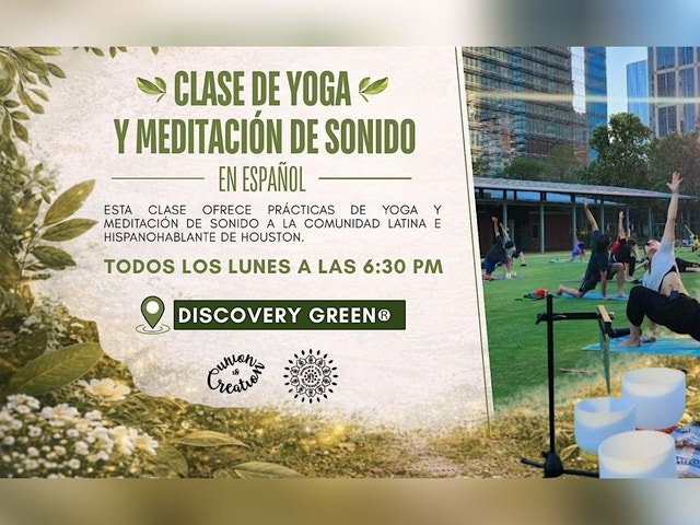 Únete a nosotros todos los lunes a las 6:30 PM en Discovery Green® para una experiencia única: Clase de Yoga y Meditación de Sonido en Español. Durante esta sesión en español, ofreceremos prácticas de yoga y meditación de sonido diseñadas especialmente para la comunidad latina e hispanohablante de Houston. La clase está abierta a todos los niveles y combina movimiento consciente, respiración y frecuencias sonoras que invitan a la calma, la reflexión y la conexión interior. Inspirada en la importancia de la salud, la paz y el bienestar comunitario, esta práctica crea un espacio de unión, serenidad y energía positiva en un entorno natural y vibrante. Qué traer: 🧘 Tu mat de yoga 💧 Botella de agua 👕 Ropa cómoda Ya sea tu primera vez practicando o tengas experiencia, eres bienvenido a compartir este espacio de paz y comunidad.