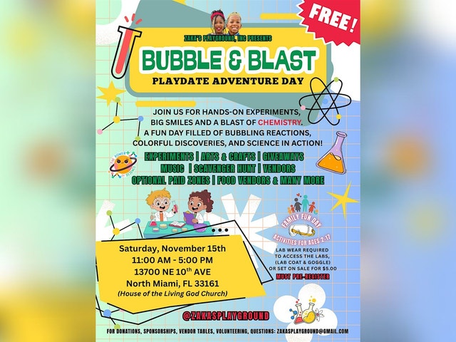 A FUN DAY FILLED OF BUBBLING REACTIONS, COLORFUL DISCOVERIES, AND SCIENCE IN ACTION! FREE EVENT! FREE EVENT! FAMILY FUN DAY - ACTIVITIES FOR AGES 2-17 YEARS OLD - FREE EVENT ***PLEASE NOTE: LAB WEAR REQUIRED TO ACCESS THE LABS TO CONDUCT THE EXPERIMENTS, (LAB COAT & GOGGLE) OR SET ON SALE FOR $5.00 AT CHECK-IN. LOCAL VENDORS WILL BE PRESENT. PREMIUM PAID-ACTIVITY INCLUDE "LIVE PAINTING WITH A TWIST, SCIENCE THEME" FOR DONATIONS, SPONSORSHIPS, VENDOR TABLES, VOLUNTEERING, QUESTIONS: ZAKASPLAYGROUND@GMAIL.COM OR @ZAKASPLAYGROUND