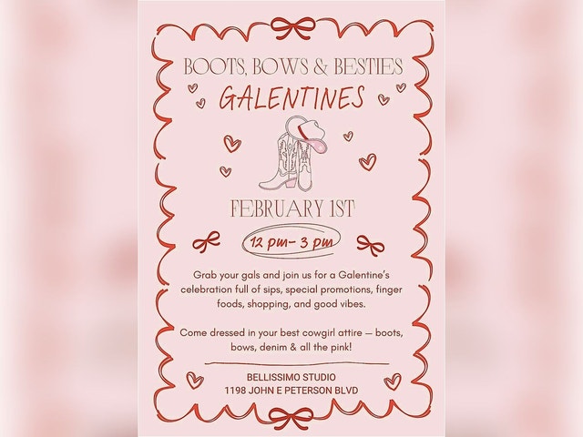 BOOTS, BOWS & BESTIES GALENTINES Get ready for a fun-filled day with your favorite besties! Join us in person to celebrate friendship, laughter, and good vibes. Think boots, bows, and all the sweet moments that make Galentines special. Whether you’re dressing up or just coming to chill, this is the perfect chance to bond and make new memories. Don’t miss out on the laughter, love, and all the fun—see you there!