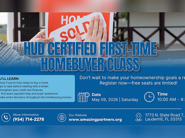 First-time homebuyer class, HUD certified homebuyer, homeownership education, down payment assistance, credit improvement for homebuyers, buy a home in Lauderhill, homebuying tips, free homebuyer class, real estate workshop, first-time homebuyer program Join our HUD Certified First-Time Homebuyer Class in Lauderhill, FL, and take the first step toward achieving your homeownership dreams. This free educational workshop covers essential topics like financing, credit, down payment assistance, and smart homebuying decisions. Seats are limited, so register today to secure your spot! Event: HUD Certified First-Time Homebuyer Class Date & Time: Saturday, May 9, 2026 | 10:00 AM – 4:30 PM Location: 1773 N. State Road 7, Lauderhill, FL 33313 Registration: Free – Reserve your spot now! Register Here Contact: (954) 714-2278 | www.amazingpartners.org What You’ll Learn: * How to determine if you’re ready to buy your first home * Steps to take before meeting with a lender * Ways to improve your credit and finances * How to access down payment assistance and buyer programs * Smart decision-making throughout the homebuying process Don’t wait to make your homeownership goals a reality. Register now—free seats are limited!