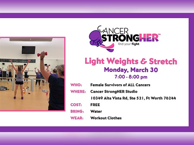 Join Susan Phillips for a strength-building weights training class! Participants can use light weights (or no weights) to help build bone density and lean muscle. We will finish class with a great stretch. No experience necessary, and all levels are welcome and encouraged! We will provide mats and weights, but you may bring your own yoga mat if you prefer. Please bring a water bottle and wear comfortable clothing and athletic shoes. Very importantly, please make sure you are cleared for regular exercise from your doctor.