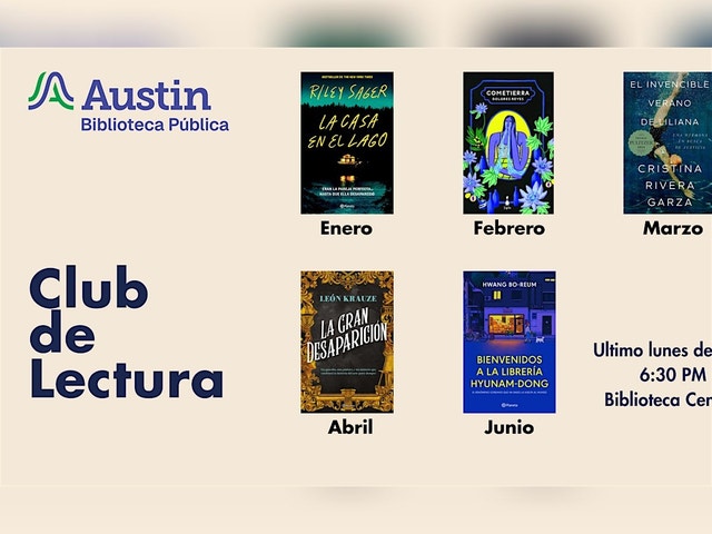 ¿Le gusta leer en español? ¡Únase a nuestro Club de Lectura! Cada mes discutiremos un nuevo libro. Si no puede acompañarnos en persona, también puede participar de manera virtual. Por favor, regístrese en Eventbrite para asistir. Con la información proporcionada durante el registro, su moderador le enviará un enlace para conectarse virtualmente antes del evento. Si asistirá en persona, nos reuniremos en la Biblioteca Central en la Esquina de las Semillas (Esquina Noroeste del 6to Piso). Libros: Enero: La casa en el lago [https://austin.bibliocommons.com/v2/record/S67C2251242] de Riley Sager Febrero: Cometierra [https://austin.bibliocommons.com/v2/record/S67C2199168] de Dolores Reyes Marzo: El invencible verano de Liliana [https://austin.bibliocommons.com/v2/record/S67C2207357] de Cristina Rivera Garza Abril: La gran desaparición [https://austin.bibliocommons.com/v2/record/S67C2251222] de Leon Krauze Junio: Bienvenidos a la librería Hyunam-Dong [https://austin.bibliocommons.com/v2/record/S67C2251240] de Po-rŭm Hwang