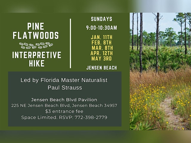 · Traverse the park with a park naturalist as your guide! Hike up to 1.5 miles of trail while experiencing the beautiful sights and sounds of the pine flatwoods at the Jensen Beach Blvd entrance to Savannas Preserve State Park. Reservations required as space is limited to 10 spots to ensure that all have a chance to hear and see what the guide is discussing. If you are unable to sign up for a particular date, it is fully booked. · The group will meet at 9 am at the Jensen Beach Blvd Pavilion located at 225 NE Jensen Beach Blvd, Jensen Beach 34957. Please bring water and sun protection. Restrooms are provided. The hike is free with paid park admission fee of $3 per vehicle - you can purchase a one day pass online by visiting https://reserve.floridastateparks.org/Web/Memberships/CustomerMembershipPasses.aspx or you can purchase your pass at the park entrance with exact cash or via credit card using the posted QR Codes on the yellow honor box. Please write the confirmation number on the blue envelope before dropping it into the yellow box and hang the blue hanger in your windshield. If you have an annual pass, please write your pass number on the blue envelope and drop it in the box. This way Tallahassee can see how many visitors utilize our park. · For questions, please call: 772-398-2779