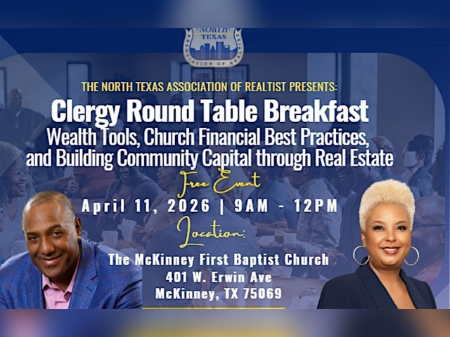 Join us for a delicious FREE breakfast and engaging discussion at The McKinney First Baptist Church (401 W Erwin Ave) to explore the importance of stewardship in our community. This in-person event will bring together accredited professionals, speakers, faith-based community leaders, and strategists to share insights and best practices for preserving and enhancing our land for future generations and to unveil wealth-building strategies. Don't miss this opportunity to connect and make a positive impact on our environment. Register now to secure your spot at the table! Registration is required for headcount. For more information call Roz Booker, 972-679-9311, or email narebnorthtexas@gmail.com