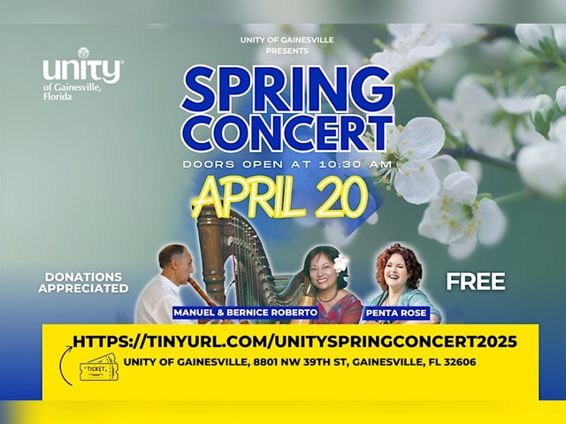 SPRING CONCERT AT UNITY OF GAINESVILLE Join us for a soul-stirring celebration of music, renewal, and community! Date: Sunday, April 20, 2025 Doors Open: 10:30 AM Starts at 11:00 AM Location: Unity of Gainesville, 8801 NW 39th St, Gainesville, FL 32606 Admission: FREE ($20 Donations Appreciated) As spring brings new beginnings, let’s gather for an uplifting concert featuring incredible live performances by: Manuel & Bernice Roberto Penta Rose Toya Colman Why Attend? * Experience the healing power of music in a welcoming atmosphere. * Celebrate the joy of spring with a diverse lineup of talented musicians. * Connect with your community in a space filled with harmony and positivity. * Reserve your free spot today and join us for an unforgettable musical experience! 💛 Donations are welcome and appreciated to support our mission.