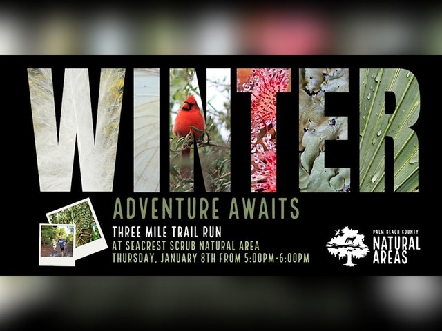 REGISTRATION OPENS 12/22 @ 12 PM This guided trail run will take participants through the pines on the most scenic trails in Palm Beach County along the challenging scrub sand at Seacrest Scrub Natural Area. Seacrest Scrub is located at 3400 S Seacrest Blvd, Boynton Beach. Meet in the parking lot. Please note that there is not a restroom on site. We will have a water cooler available. The run will cover approximately 3 miles and take participants through a variety of habitats on a combination of hardened and primitive trails. WHAT TO BRING: Water bottle. Hat and sunscreen. Insect repellent. Please no pets or unaccompanied minors.