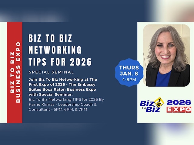 THE FIRST BIZ TO BIZ BUSINESS EXPO OF 2026 WITH SPECIAL SEMINAR: BIZ TO BIZ NETWORKING TIPS FOR 2026 BY KARRIE KLIMAS - LEADERSHIP COACH & CONSULTANT - FREE SEMINAR THURSDAY, JANUARY 8TH DURING THE BIZ TO BIZ BUSINESS EXPO AT THE EMBASSY SUITES BY HILTON BOCA RATON FORM 4-8PM LOCATION: BIZ TO BIZ EXPO AT THE EMBASSY SUITES BOCA RATON. 661 NW 53RD ST, BOCA RATON, FL 33487 THE SEMINARS WILL BE TAKING PLACE AT GREAT PARTNERSHIP SOLUTIONS TABLE: 5PM, 6PM, AND 7PM DURING THE EXPO FREE SEMINAR BIZ TO BIZ NETWORKING TIPS FOR 2026 BY KARRIE KLIMAS- LEADERSHIP COACH & CONSULTANT Seminar Key Topics: * The importance of attending inperson Events * Utilize informational interviews * Optimize your Linkedin Profile * Craft a Strong Elevator Pitch * Follow Up Consistently * Engage in Relevant ONline Communities * Colunteer in your Field * Be Authentic and Genuine * Seek out Divers Perspectives * Stay Updates on Industry Trends OFFERED WORKSHOPS TO HELP GROW YOUR BUSINESS BY KARRIE KLIMAS 1/1 & Group Workshops: Interactive, Informative in person and virtual events 1. Professional Success Workshops a. Networking Skills & Practice Workshops b. Goal Setting Workshop 2. Professional Growth Workshops a. Creative Tools b. Career Essentials c. Scheduling d. On-Line Presence Specialty Workshops: Administrative, Marketiing & Visibility Solutions All Biz To Biz Networking Events and Expos: biztobiznetworking.com [https://biztobiznetworking.com/]