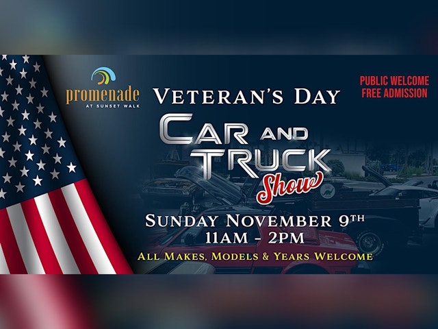 Promenade at Sunset Walk's 1st Annual Veterans Day Car & Truck Show Honoring & Celebrating the Military Veterans of the United States Armed Forces! The Streets of the Promenade will be filled with Classic to Modern Cars and Trucks from all Eras, Makes & Models. Hosted by DJ Jennifer Playing the Perfect Complement of everything from Classic Rock & Roll thru Today's Current Hits. 12:00 Noon — The National Anthem, plus the Osceola County Sheriff’s Office Color Guard presenting Our Nation’s Colors. Hundreds of dollars in raffle prize giveaways every month including a stay at the 4 - Star Margaritaville Resort Hotel to Show Car Participants plus Top 3 "Merchant's Choice" Trophies. Be sure to Visit all of the Restaurants, Sunday Brunches, Shops and Entertainment options at the Promenade at Sunset Walk. Show Car & Truck Owners, You are welcome to arrive as Early as 8:30am for Car Show set up Free Admission & Free Parking - No Outside Food & Beverage SHOW CAR DRIVERS, PLEASE PRESENT YOUR VALID DRIVER'S LICENSE AND PROOF OF INSURANCE FOR ENTRY! NOTICE: ONLY RSVPs or TICKETS PURCHASED THROUGH THE EVENTBRITE PLATFORM WILL BE HONORED. THERE ARE NO AUTHORIZED THIRD PARTY TICKETING PLATFORMS.