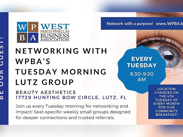 Welcome to the WPBA's Tuesday Morning Lutz Focus Group! Join us for our weekly small-group networking event at Beauty Aesthetics. This is the perfect opportunity to meet like-minded individuals, share ideas, and build connections in a relaxed setting. Whether you're a seasoned professional or just starting out, this event is open to all guests looking for a network and friendships beyond the business card and elevator pitch. Come ready to engage, learn, and have a great time! We can't wait to see you there! Guests are encouraged to attend once or twice before committing to joining us as a member. About The West Pasco/Pinellas Business Association (WPBA): The West Pasco Business Association (WPBA) is a business networking group of 160+ businesses and nonprofits working together to strengthen our community. Since its founding in 2010, WPBA has disbursed over $3 million locally to help families and individuals in crisis, while also creating programs that support small business growth, workforce development, and nonprofit collaboration. WPBA continues to expand its impact through initiatives like: • WPBA Serves – monthly service projects supporting local charities, food pantries, and neighbors in need. • Community Connections Program – linking businesses with nonprofits for greater community-wide impact. Our partners attend monthly and weekly community events, and change lives at the same time. We host multiple signature annual events, allowing us to put hundreds of thousands of dollars back into our local communities of Pasco and Pinellas through charitable giving. Together, we celebrate growth, show up for each other, and make a tangible difference across Pasco and Pinellas Counties. WPBA: Where businesses connect, communities thrive, and impact multiplies. NOTE: Check West Pasco Business Association's Eventbrite listings, Facebook page or calendar at wpba.biz/community-events [https://www.wpba.biz/community-events] for the full details and other networking opportunities!