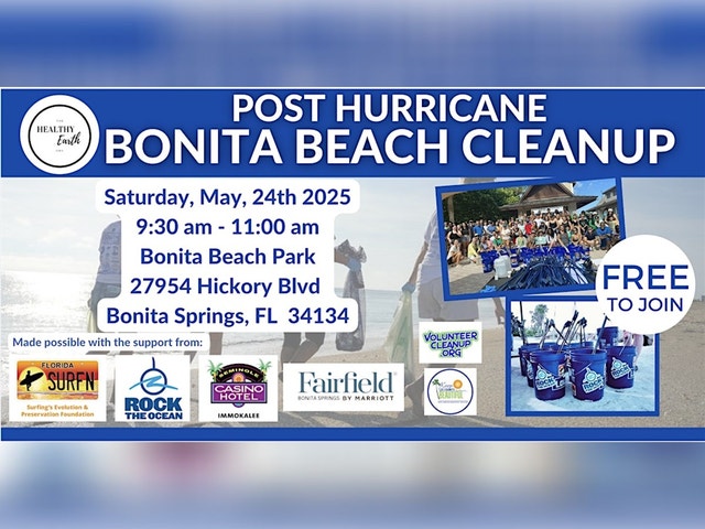 Event: Bonita Beach Cleanup Date: May 24th, 2025 Time: 9:30 am - 11 am Location: Bonita Beach Park 27954 Hickory Blvd, Bonita Springs, FL 34134 We provide Free Parking thanks to Lee County Parks and Rec. What To Bring: Reuseable water bottle and wear comfortable clothes. We suggest a hat and sunglasses. What We Provide: All tools needed, sunblock, water refill jug, light snacks, and designated team members who take pictures and ensure safety. Safety Guidelines: Drink plenty of water and take breaks as needed. Set a timer to come back at set time. Watch out for sharp objects, glass, and wildlife. Avoid heavy lifting and work with a buddy at all times. Do not touch hazardous materials such as needles or chemicals. Report heavy items to our designated team member. Post Cleanup: Weigh your buckets and join the group photo at 10:45 am. Why Help: Beach cleanups are a last line of defense to prevent debris from causing harm to our oceans, to wildlife, to our coastal economies, and even beach-goers. After Hurricane Milton these efforts are needed more than ever.