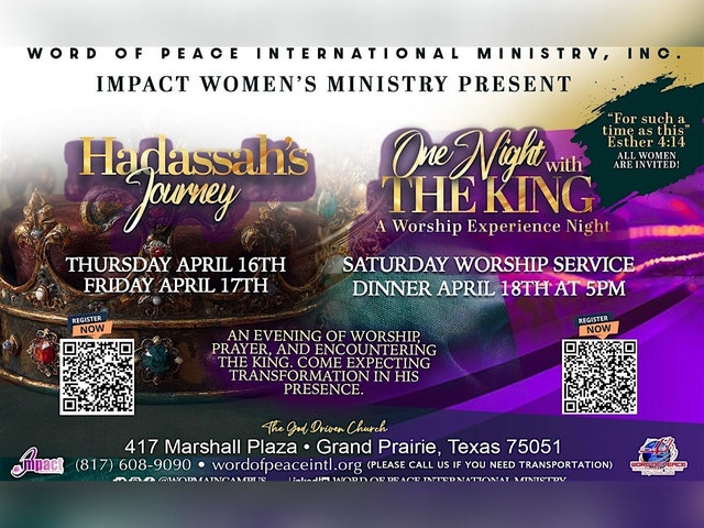The Word of Peace Impact Women's Ministry welcomes all ladies to see how Queen Esther journey's towards her "One Night with the King!" Beautiful little Hadassah, orphaned but raised by a caring older cousin travails through tumultuous times to find herself in the palace preparing to meet the king - with the chance of a lifetime to become queen - and she outshines everyone with the favor of God! We welcome you to discover how little Hadassah transitions into Queen Esther - invite every woman that you know to follow this impactful journey to encounter His Majesty, our King! Hadassah Walk-through Journey Tour: April 16-17th from 10:30am - 7:30pm The Journey is held at WOP Main Campus No cost for you, family, or friends to experience Scan the QR Code to register your walkthrough or call 817.608.9090 for more information "One Night with the King" Formal Worship Service and Banquet: Saturday, April 18th from 5-7pm VIP TICKETS are only $85 and includes priority check-in, early entry, premium reserved seating, a dedicated VIP Host, Special VIP gift/swag bag! GENERAL ADMISSION TICKET is $35 and includes Worship Service and Dinner only