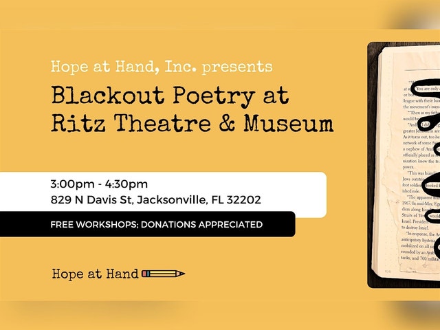 In this workshop, you will learn how to create blackout poetry. To “write” this poem, you will be given a page ripped out (gasp!) of a book, then you cross out 90% of the words. The words left on the page make your poem. All supplies, materials and instruction are provided by HopeAtHand.org, free of charge. Hope at Hand is sponsored in part by City of Jacksonville, Cultural Council of Greater Jacksonville, The Jim Moran Foundation, Florida Division of Arts and Culture, Dolores Barr Weaver Legacy Fund, Cummer Family Foundation and generous supporters just like you! See some examples below