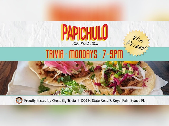 MONDAY NIGHT TRIVIA! Unleash Your Inner Brainiac & Devour Deliciousness at PapiChulo's Monday Night Trivia! Calling all trivia titans and taco enthusiasts! Unleash your competitive spirit and knowledge every Monday night from 7:00 to 9:00 PM at the vibrant PapiChulo in Royal Palm Beach. Join the electrifying Great Big Trivia for a night of brain-busting fun! Assemble your A-team and put your pop culture prowess, historical expertise, and scientific savvy to the test. Battle it out for epic prizes and bragging rights that will last a lifetime. But the fun doesn't stop there! PapiChulo's boasts a fiesta of flavors guaranteed to tantalize your taste buds. Dive into their signature Mexican street tacos, overflowing with fresh ingredients and bold, authentic seasonings. Their menu is a journey for your senses, featuring delectable options like al pastor, barbacoa, carnitas, and fresh, vegetarian fillings. Amp up your game night with refreshing juices, handcrafted cocktails, and an extensive tequila selection. The lively, beach bar atmosphere at PapiChulo's is perfect for letting loose and creating unforgettable memories with friends. Mondays just got a whole lot more exciting! Head down to PapiChulo in Royal Palm Beach and turn trivia night into a delicious adventure. See you there!