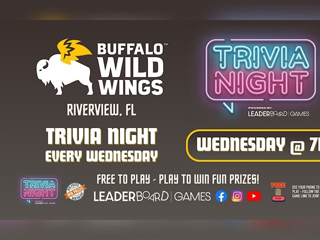 Trivia Game Night at Buffalo Wild Wings - Riverview FL every WEDNESDAY at 7pm! Test your knowledge, compete for prizes, and enjoy a fun-filled evening of trivia and laughter with your team. Free to Play - have to Play to WIN PRIZES! Trivia Night features an interactive trivia game format, with a mix of rounds including image round and music round in every show. The event is hosted live in person by one of our super fun Game Hosts. Teams & players use their phone to play by following the game link to submit answers and get points, making it easy to play and fun for all. What to expect: * Engaging Trivia Rounds: Dive into diverse trivia topics from pop culture to history. * Team-Based Challenge: Join forces with friends for collaborative trivia fun. * Prizes Galore: Compete for fabulous rewards and aim for the top spot. * Lively Atmosphere: Experience a night of friendly competition and camaraderie. Don't miss this thrilling trivia extravaganza! Get your best team together, Free to Play but you have to Play to Win!!! #trivia #triviagame #TriviaNight #GameNight #QuizTime #BrainTeasers #ThinkAndWin #SmartIsTheNewSexy #TestYourKnowledge #MindGames #ChallengeYourMind #QuizNight #TriviaChallenge #GameOn #TeamTrivia #TriviaMaster #TriviaTuesday #freetoplay #Riverview #Florida #FL #RiverviewFL #bww #buffalowildwings #LeaderBoardGames