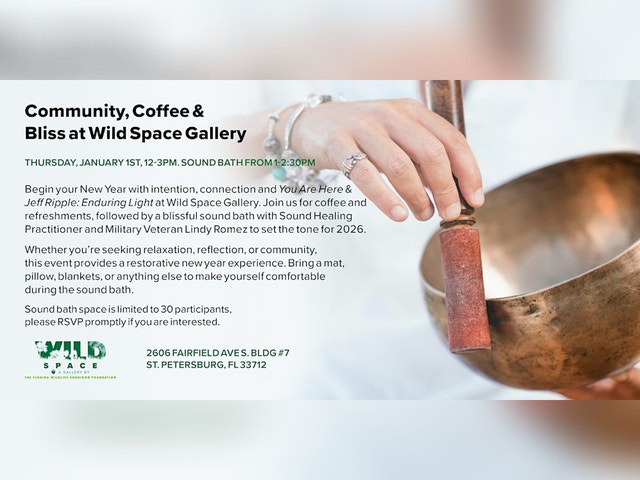 Thursday, January 1st. 12-3pm. Sound Bath From 1-2:30pm. Begin your New Year with intention, connection and You Are Here & Jeff Ripple: Enduring Light at Wild Space Gallery. Join us for coffee and refreshments, followed by a blissful sound bath with Sound Healing Practitioner and Military Veteran Lindy Romez to set the tone for 2026. Whether you’re seeking relaxation, reflection, or community, this event provides a restorative new year experience. Bring a mat, pillow, blankets, or anything else to make yourself comfortable during the sound bath. All are welcome at this free event! Please RSVP promptly as space is limited to 30 people for the sound bath.